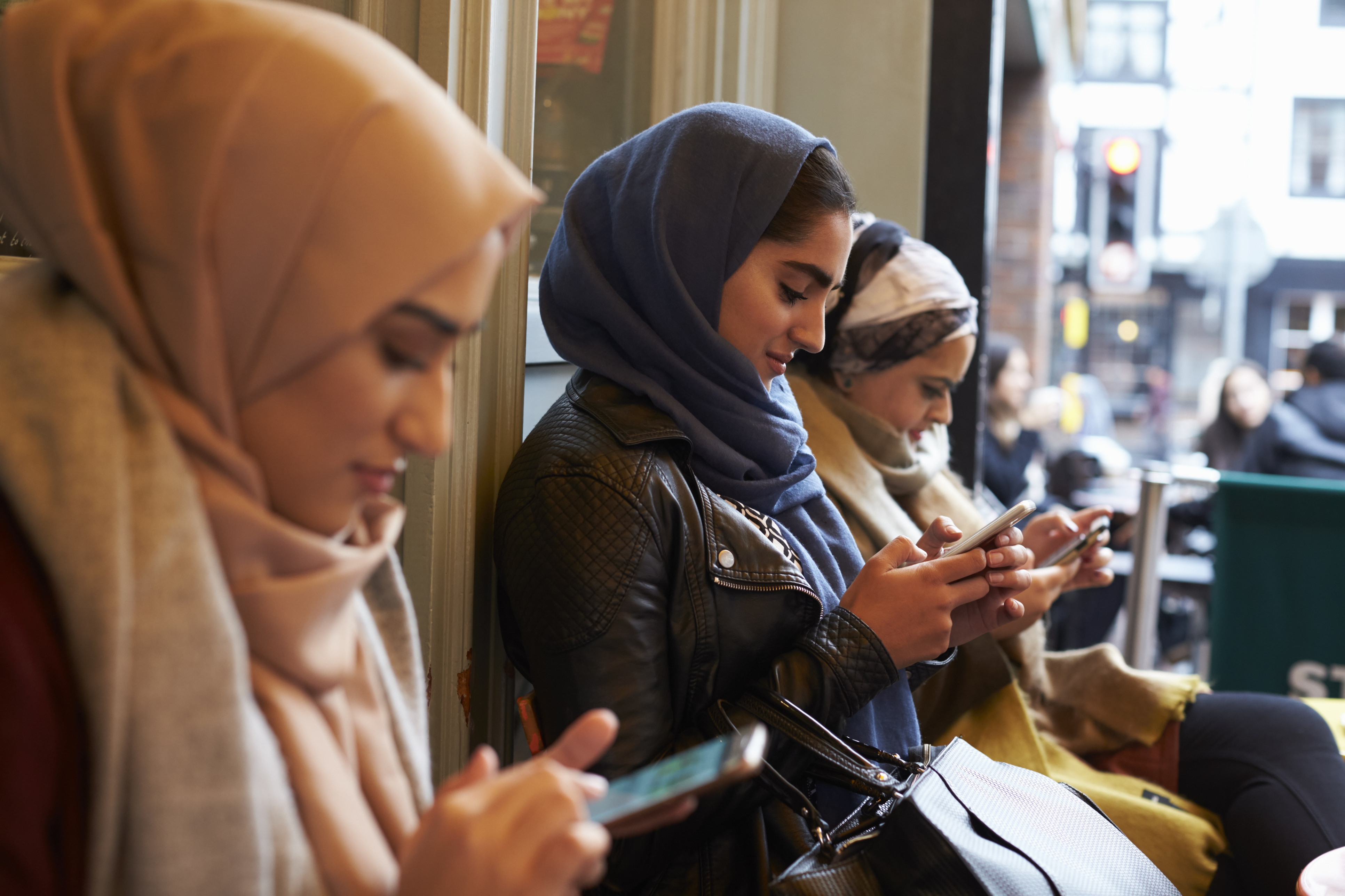 • Group Of British Muslim Women Texting Outside Coffee Shop