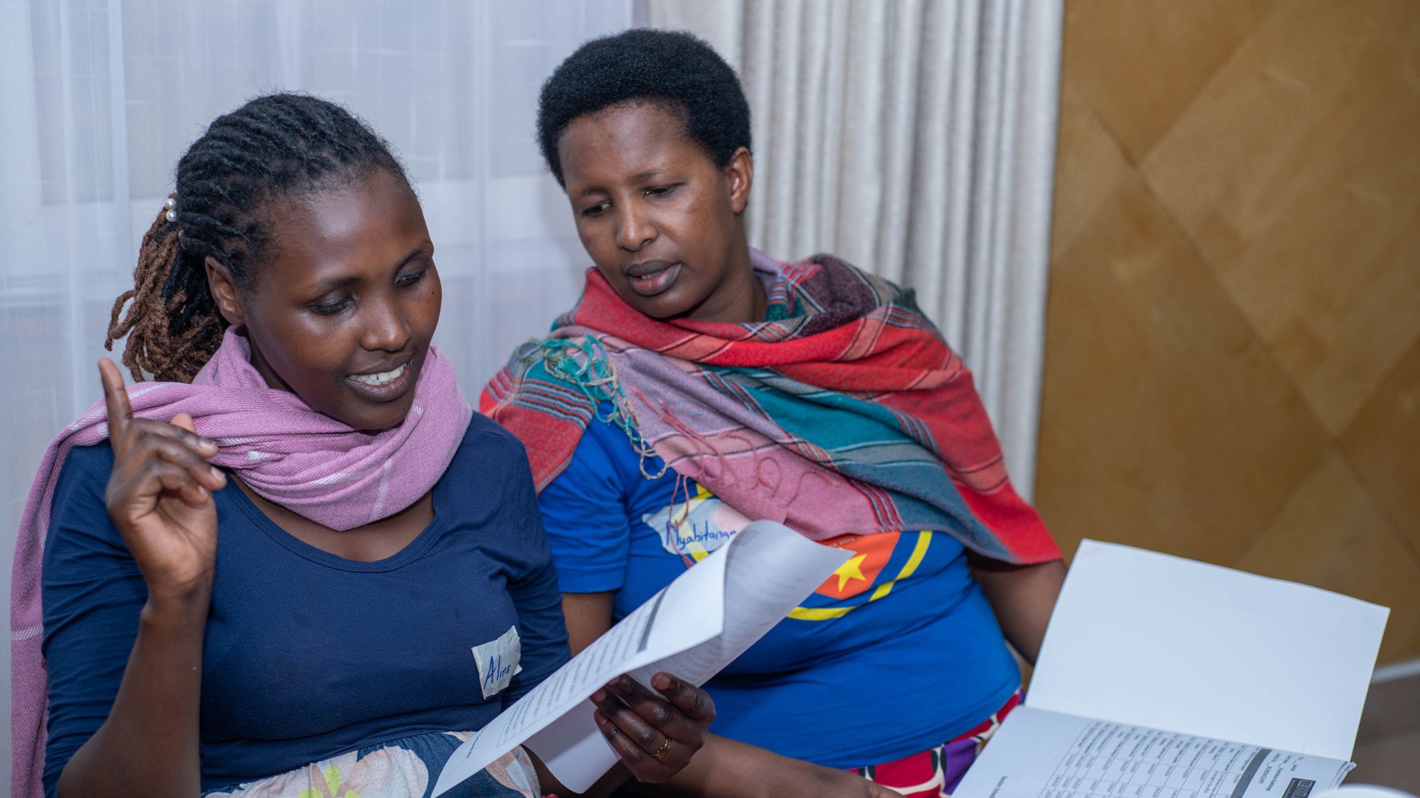 Two women wearing brightly colored scarves around their necks look over work booklets
